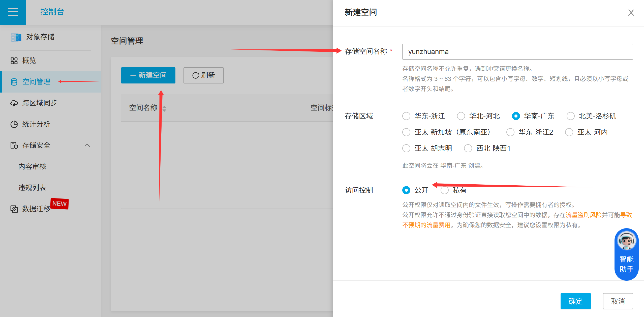 1、创建存储桶,获取Bucket,选择:单AZ,存储类型选择:标准存储,读写权限选择:公共读。获取域名:图中方框内的。